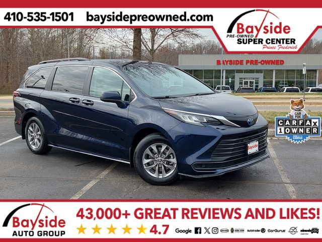 Experience the ultimate peace of mind with this exceptional CERTIFIED 2022 Toyota Sienna LE, a one-owner vehicle with a perfectly clean CarFax that is ready to elevate your familyâs daily commute. This 8-passenger hybrid minivan is the gold standard for reliability and efficiency, boasting an impressive 36 MPG combined that keeps your fuel budget in check while navigating school drop-offs and weekend errands. Designed with the modern family in mind, it features dual power-sliding doors for effortless entry in tight parking lots, three-zone automatic climate control to keep everyone comfortable, and the comprehensive Toyota Safety Sense 2.0 suiteâ"including pre-collision braking and adaptive cruise controlâ"to protect your most precious cargo. With its spacious three-row interior, seamless smartphone integration through Apple CarPlay and Android Auto, and a proven track record of longevity, this Sienna isn't just a vehicle; it's a dependable partner that simplifies your life and ensures every journey is as smooth as it is safe.