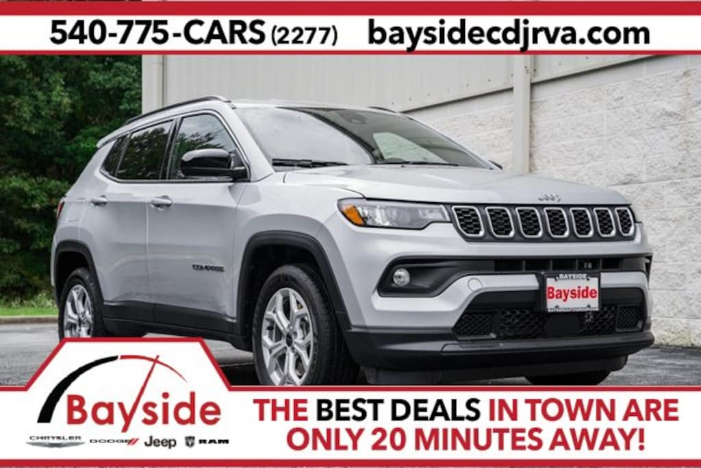 Silver Zynith Metallic Clearcoat 2025 Jeep Compass Latitude 4WD 8-Speed Automatic 2.0L I4 DOHC 17" x 7" Aluminum Wheels, 6 Speakers, Heated front seats, Heated steering wheel, ParkView Rear Back-Up Camera, Quick Order Package 29J, Remote keyless entry. Some customers may not qualify for all rebates listed, see dealer for details. Price includes: $1500 - 2025 National Retail Bonus Cash . Exp. 11/03/2025 Price includes a $1,000 rebate from Bayside CDJR in order to finance with Stellantis or another affiliated bank. Should you pay cash or finance with your own bank the rebate will be added back to the price. Price includes a $1,000 retail trade assistance. Trade must be under 80.000 miles and within 5 model years of 2024 to qualify for this rebate.