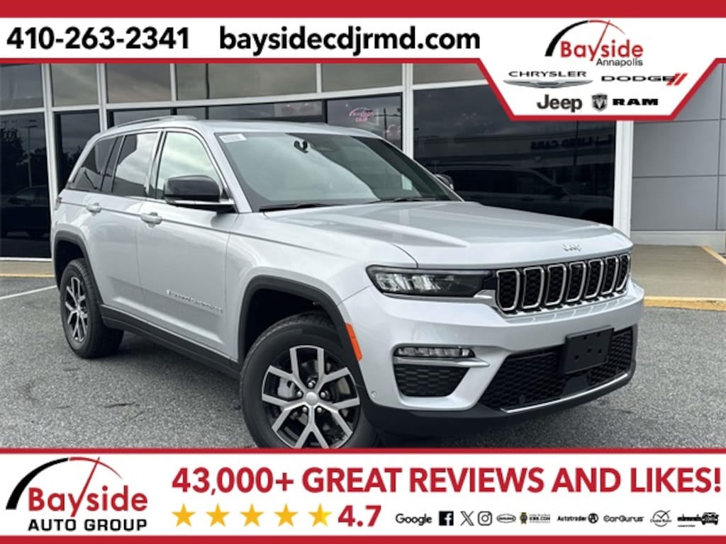 Bayside carries a full model lineup of Chrysler, Dodge, Jeep and RAM vehicles including the Jeep Grand Cherokee, Jeep Wrangler, Dodge Durango, Pacifica and RAM 1500. We invite you to shop around and compare our prices with other Chrysler, Dodge, Jeep and RAM dealerships in the Annapolis area. Let us know what you find, and let us give you our best price on the same model. We strive to earn your business and want you to be a Bayside Chrysler Dodge Jeep Ram customer for life! Visit us on the web at www.baysidecdjrmd.com. *Sale price includes all applicable rebates. Freight charge is not included. Taxes, tags and doc fee extra. Not all customers will qualify for all rebates. See dealer for details. Sale price includes all applicable rebates. Freight charge is not included. Taxes, tags and doc fee extra. Not all customers will qualify for all rebates. See dealer for details. Price includes: $1000 - 2025 National Grand Cherokee Loyalty Retail Bonus Cash . Exp. 11/03/2025 $1000 - 2025 Northeast BC SFS Lease Loyalty Bonus Cash . Exp. 11/03/2025 $1000 - Driveability / Automobility Program. Exp. 01/05/2026 $1750 - 2025 National Retail Bonus Cash . Exp. 11/03/2025 $2000 - 2025 National SFS Lease Loyalty Bonus Cash. Exp. 11/03/2025 $500 - 2025 National 2025 Military Bonus Cash. Exp. 01/05/2026 $500 - 2025 National Jeep Monopoly Money Bonus Cash . Exp. 11/03/2025
