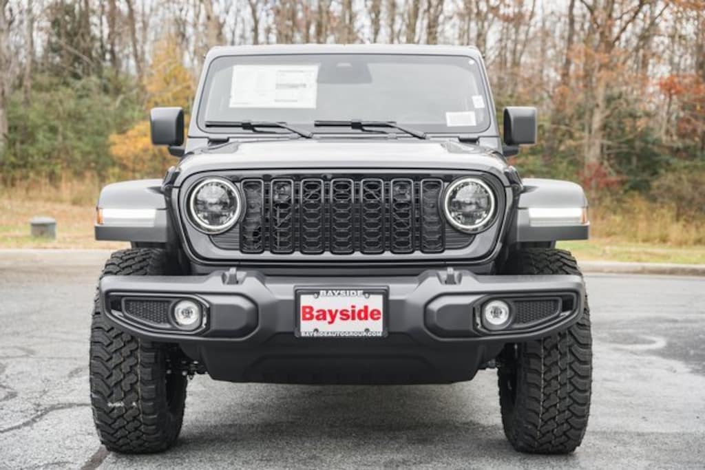 The 2026 Jeep Wrangler 4-Door Willys 4x4 blends legendary off-road performance with modern technology, featuring a 3.6L V6 engine, 8-speed automatic transmission, Command-Trac part-time 4WD, and Tru-Lok rear axle. Rugged upgrades include Willys suspension, 17-inch painted black wheels with LT285/70R17C mud-terrain tires, Off-Road Plus mode, rock-protection sill rails, and auxiliary switches for off-road accessories. Inside, it offers Black perforated leather seats, Uconnect 5 with 12.3-inch touchscreen, Apple CarPlay/Android Auto, SiriusXM 360L, heated front seats, heated steering wheel, and a Black 3-piece hard top with Freedom Panel storage.