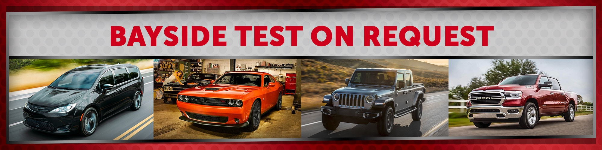 We will bring a vehicle to your home for a test drive, but we will also bring the Bayside CDJR showroom to you. Our website provides the chance to purchase one of our vehicles online by applying for financing and scheduling the delivery. When the sales professional arrives for the test drive, they also will have all paperwork necessary to complete the sale if you choose to buy. Begin this seamless process today by scheduling a test drive through the Bayside Test On Request program.
